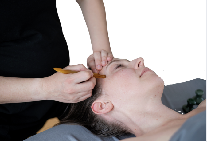 This facial massage treatment is rooted in Traditional Chinese Medicine. It incorporates bo jin and facial gua sha techniques to deeply relax the muscles of the face, neck, and upper chest. A comb-like tool is used to massage the scalp, melting away tension and stimulating blood flow. After warming the skin with steamed towels, the face is gently cleansed with jojoba oil to prepare for gua sha and bo jin. Before the bo jin treatment, Susan incorporates gentle lymphatic drainage massage techniques in the neck and face with terahertz stones, followed by uplifting strokes using a stainless steel gua sha board as well as a smooth pointed tool to relieve muscle tension, promote increased circulation and collagen production, and reduce puffiness. Susan uses a skin elixir formulated specifically for the face. To enhance relaxation during this treatment, you will also receive neck and shoulder massage.